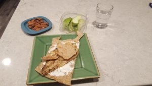 Vacsorára grillezett csirkemell teljes kiőrlésű lisztből készült pitával és sajtkrémmel. Desszertnek az ISTENI zöld alma + mandulamag kombó (NYAMI)